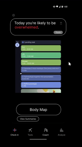 Complementing the subjective approach, I added optional biometric and calendar integrations to add more objective sources of information. The data can be leverages to develop proactive insights