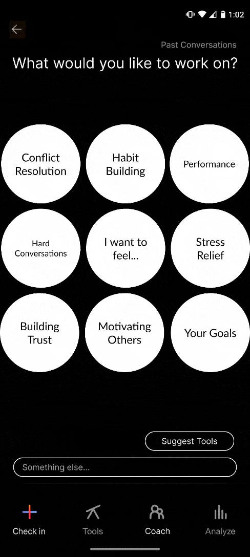 It became clear that users needed a better way to find insights within all this information. To that end, I developed an AI Coach interface where users could ask questions about their patterns, set goals for their emotional wellbeing, and reverse engineer the conditions associated with desired emotional states.