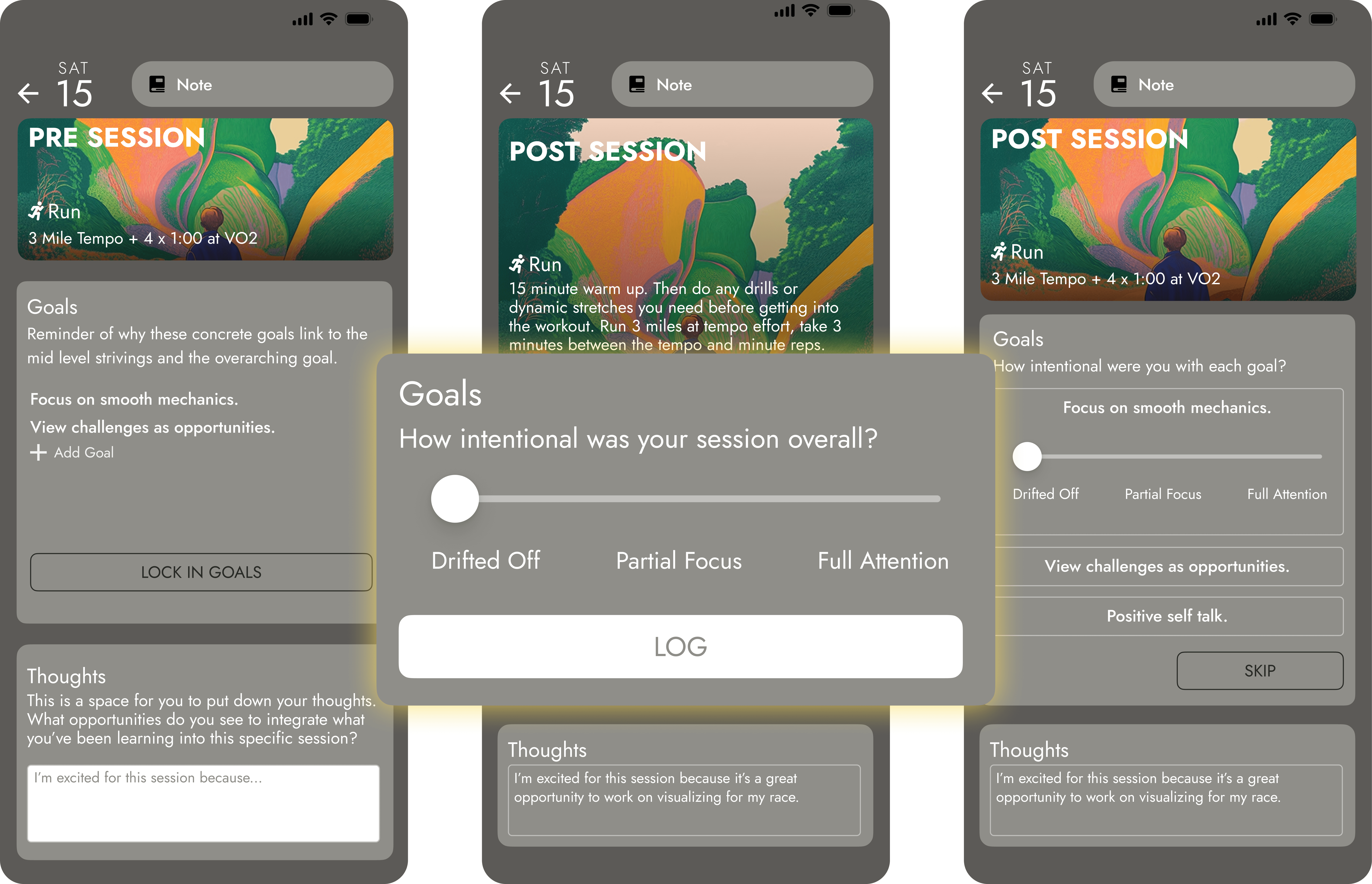 Working with a sports psychologist, it became clear that intentionality is the metric of sustainable success. With that in mind I set about making intentionality visible in training. The old adage "what gets measured gets managed" rings true in the athletic world and I wanted to give athletes a way to visualize the quality of their intention in their training from a single session to a season.